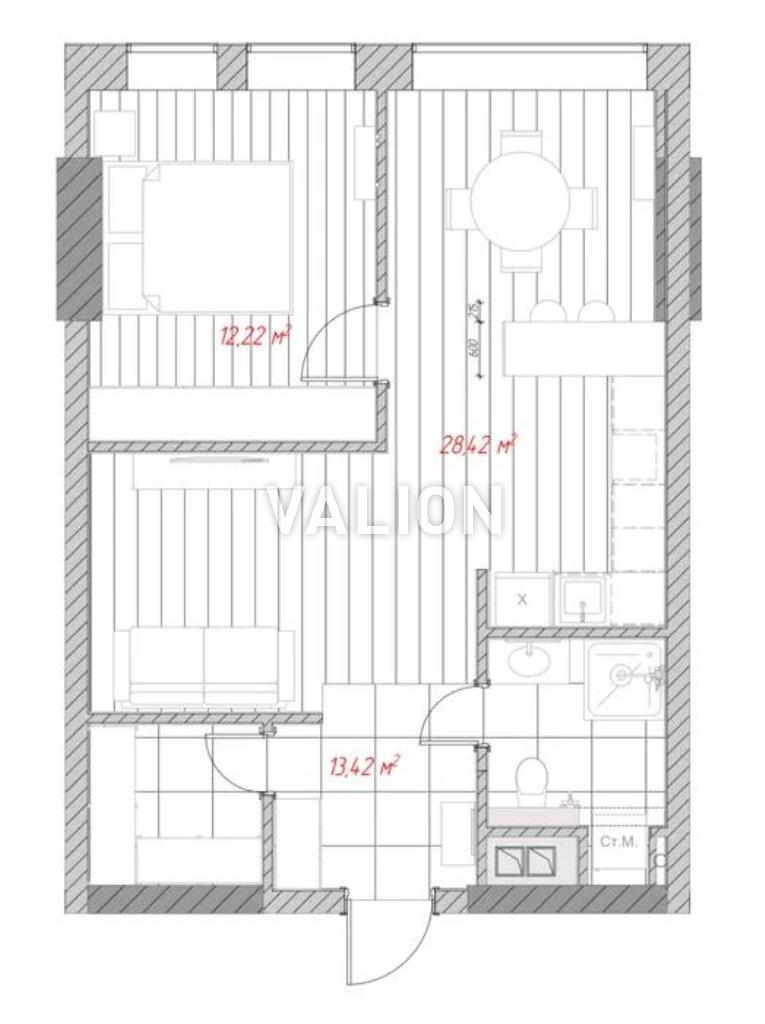 • Общая площадь 60 кв.м., жилая площадь 33 кв.м., кухня студия 20 кв.м.