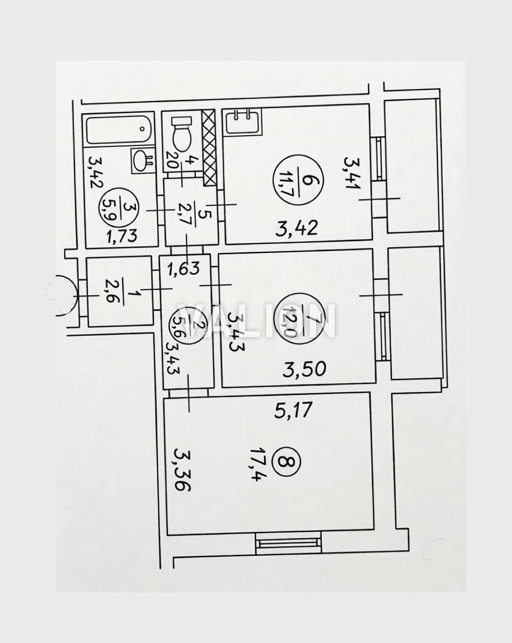 3 комнаты 87/50/20 м2 6/24 эт.