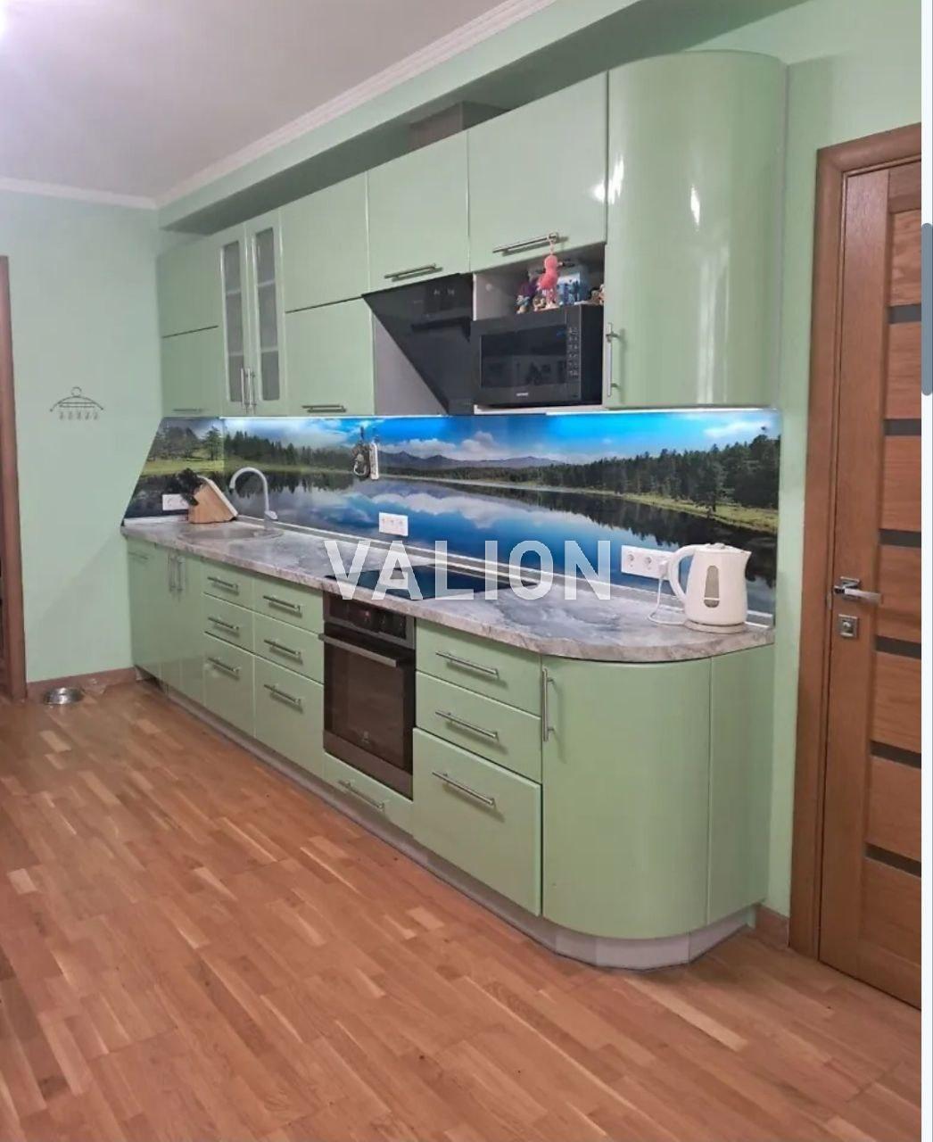 В кухне-студии выполнена звукоизоляция, потолок — гипсокартон с дополнительной шумоизоляцией. Кухонная мебель изготовлена ​​по индивидуальному проекту, рабочая поверхность со стеклянным фартуком (скинали). Установленная встроенная техника: духовой шкаф, варочная индукционная поверхность, посудомоечная машина, вытяжка, обустроена лаунж-зона.