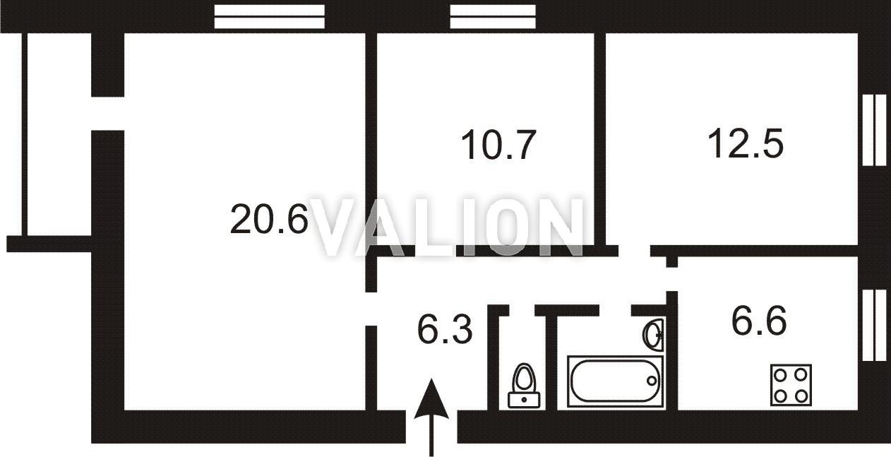 Площадь комнат: 20,6 м² / 12,5 м² / 10,7 м²