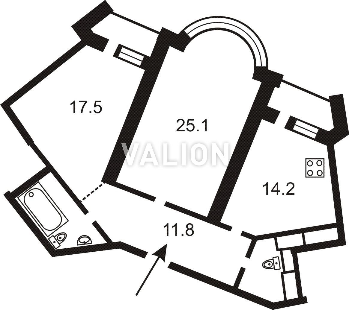 1 комната — 17,5 м2, 2 комната — 25,1 м2,