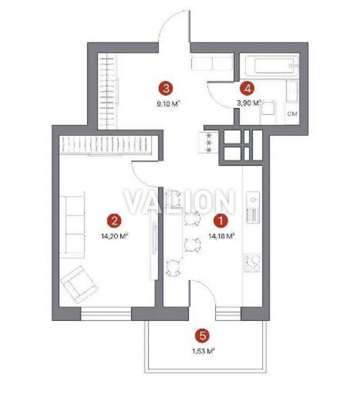 Общая площадь квартиры 43,4 кв.м, жилая – 14,2 кв.м, кухня – гостиная – 14,7 кв.м, этаж 3/16.