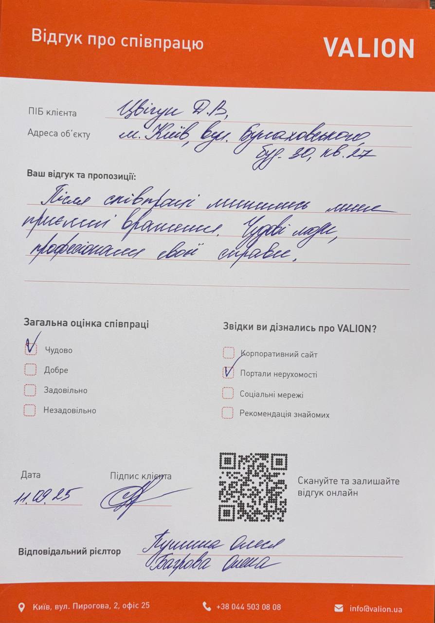 Величне дякую компанію VALION, особливо рієлтору Пушиній Олесі в купівлі квартири. Справжній професіоналізм. Комунікація на високому рівні. Допомога по всім питанням. Все дуже оперативно. Рекомендую