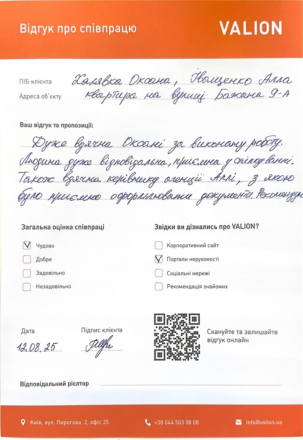 Дуже вдячна Оксані за виконану роботу. Людина дуже відповідальна, приємна у спілкуванні. Також вдячна керівнику відділу АллІ, з якою було приємно оформлювати документи. Рекомендую.
