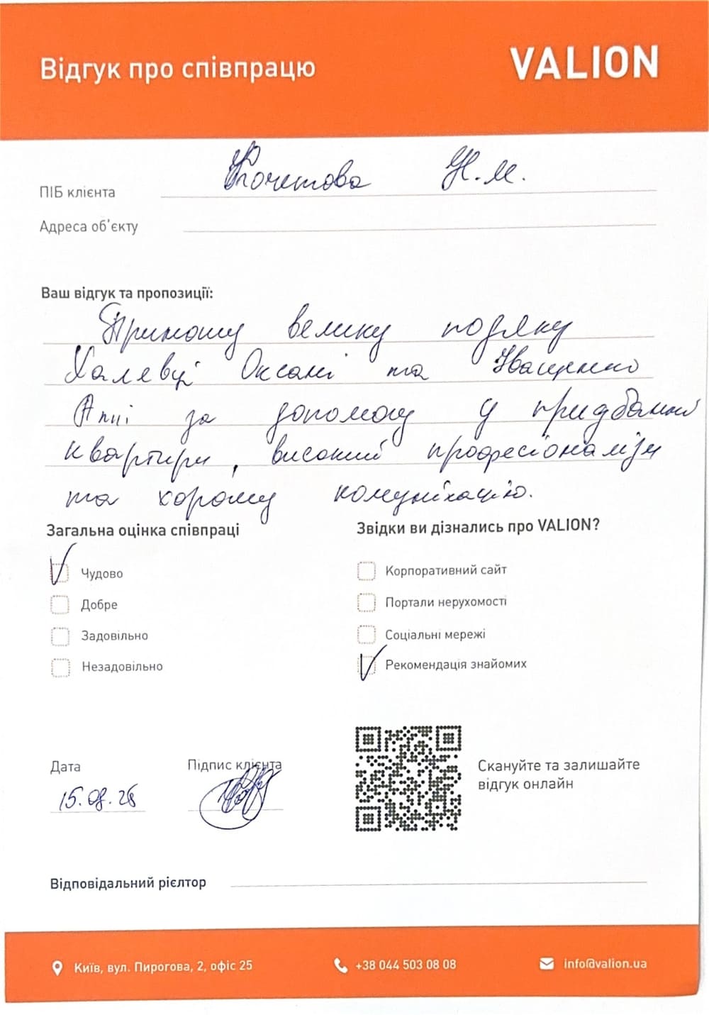 Співпрацею з компанією VALION дуже задоволені. Особлива подяка Тимошенко Олександру і керівнику відділу Іващенко Аллі. Роботу з продажу квартири Олександр виконав за 2 тижні без нарікань, дав гарні рекомендаціїї щодо підготовки квартири до продажу. Рекомендую! Це спеціалісти свого діла які не нав'язуються, але в потрібний момент все правильно підкаже і організує.