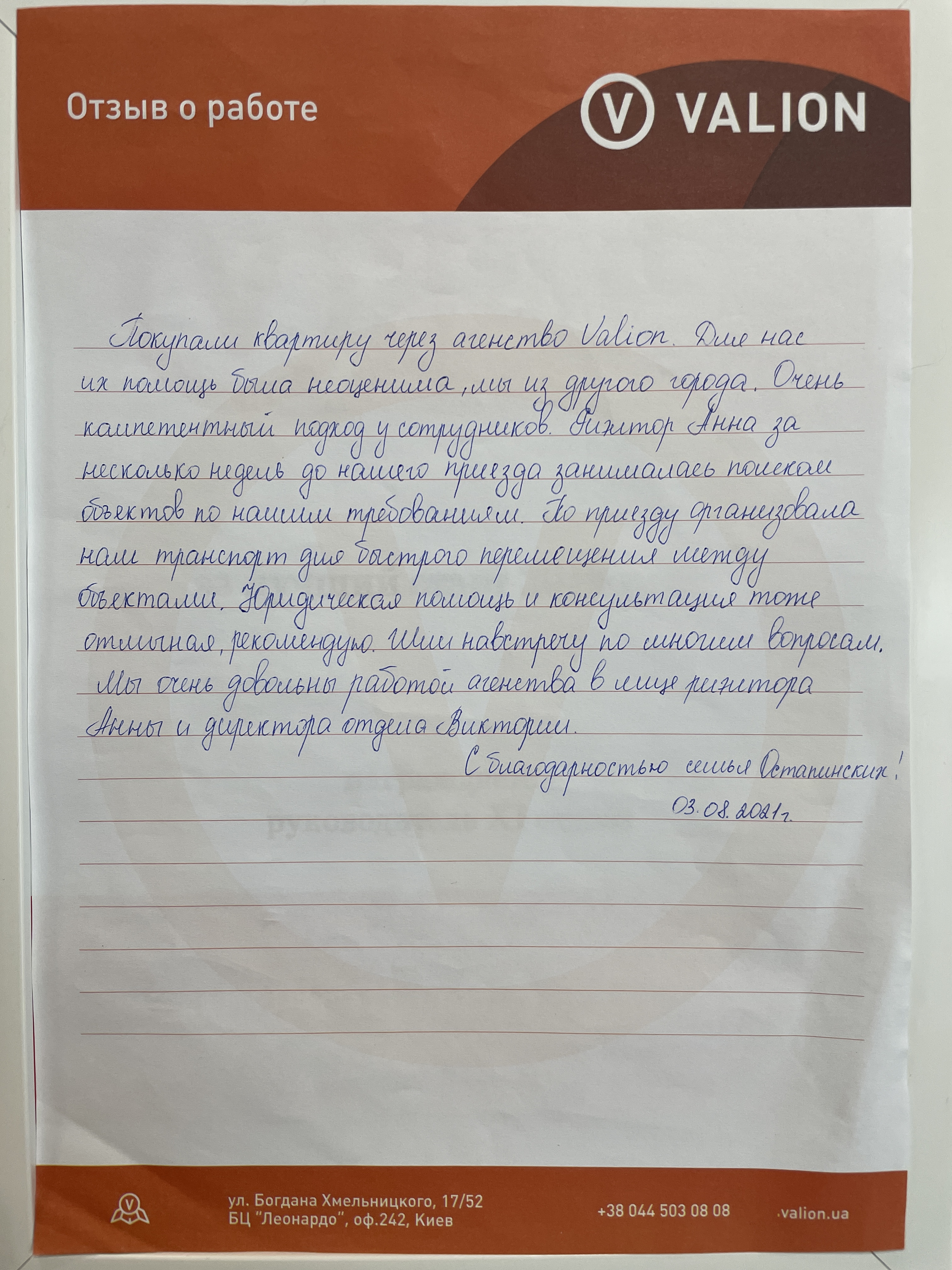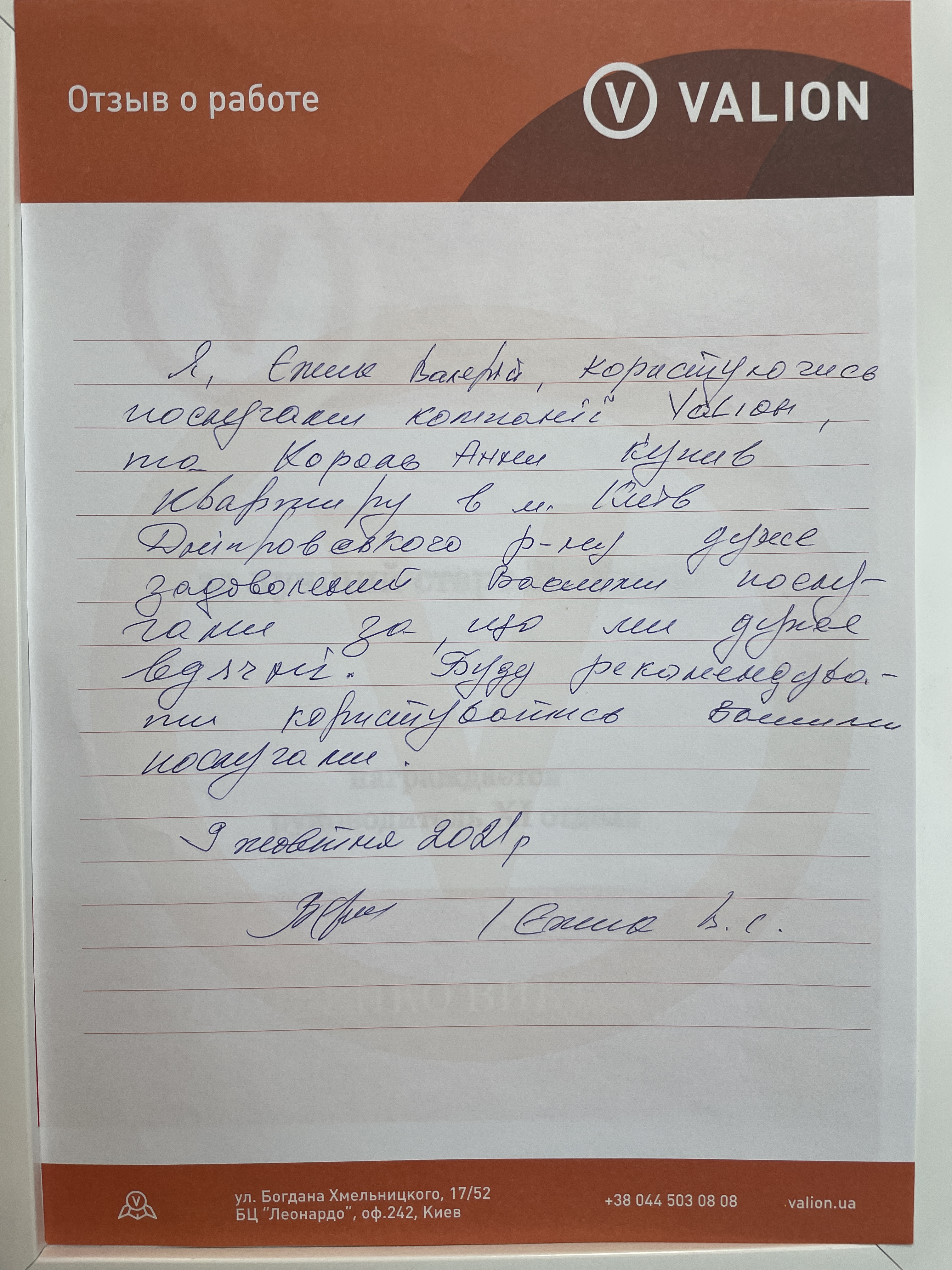 Я, Єжие Валерій, користуючись послугою компанії Valion, та Король Анни купив квартиру в м. Київ, Дніпровського р-ну. Дуже задоволений вашими послугами за, що ми дуже вдячні. Буду рекомендувати користуватися вашими послугами.