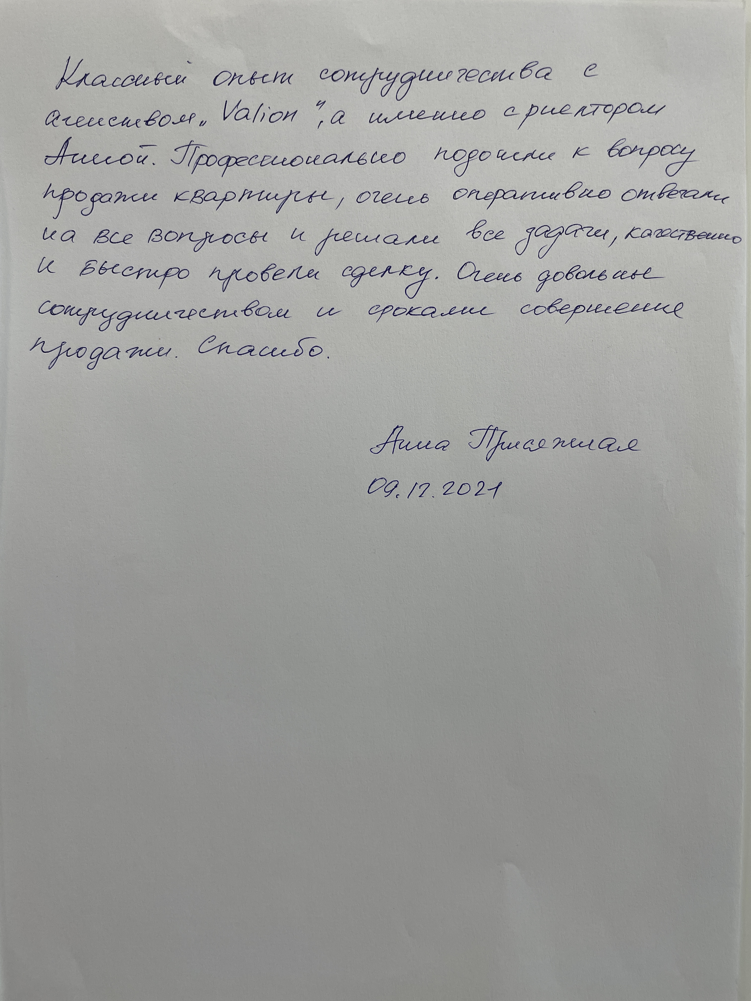 Классный опыт сотрудничества с агентством «Valion», а именно с риелтором Аной. Професианально подошли к вопросу продажи квартиры, очень оперативно отвечали на все вопросы и решили все задачи, качественно и быстро провели сделку. Очень довольны сотрудничеством и сроками совершения продажи. Спасибо.