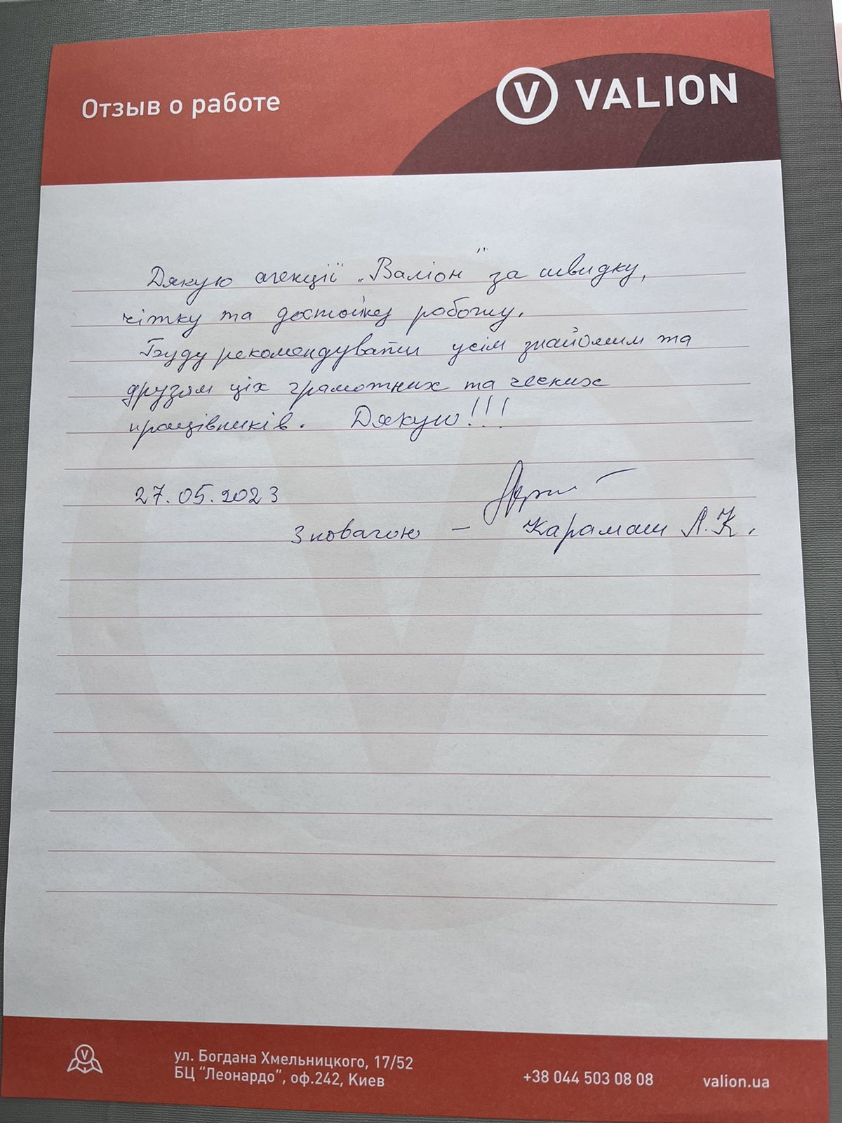 Дякую агенції Валіон за швидку, чітку та достойну роботу. Буду рекомендувати усім знайомим та друзям ціх грамотних та чесних працівників. Дякую!!! З повагою Карамаш Л.К.