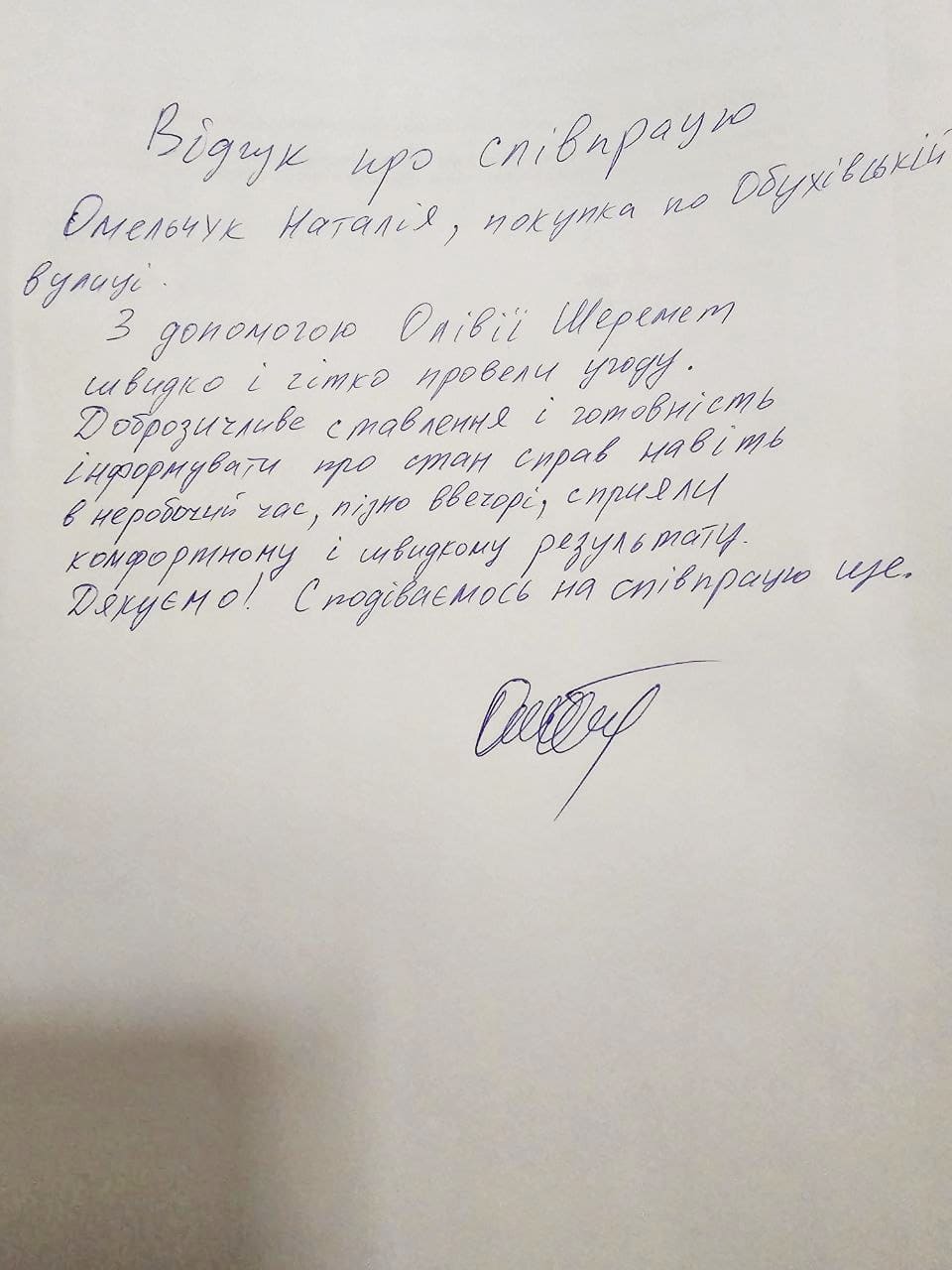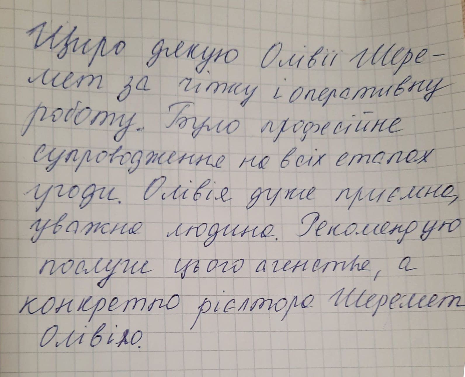 Щиро дякую Олівії Шеремет за чітку і оперативну роботу. Було професійне супроводження на всіх етапах угоди. Олівія дуже приємно, уважна людина. Рекомендую послуги цього агенства, а конкретно рієлтора Шеремет Олівію.