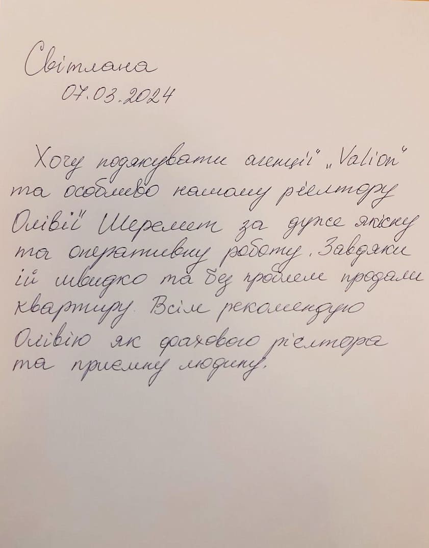 Хочу подякувати агенції «Valion» та особливо нашому ріелтору Олівії Шеремет за дуже якісну та оперативну роботу. Завдяки ій швидко та без проблем продали квартиру Всім рекомендую Олівію як фахового рієлтора та приємну людину.