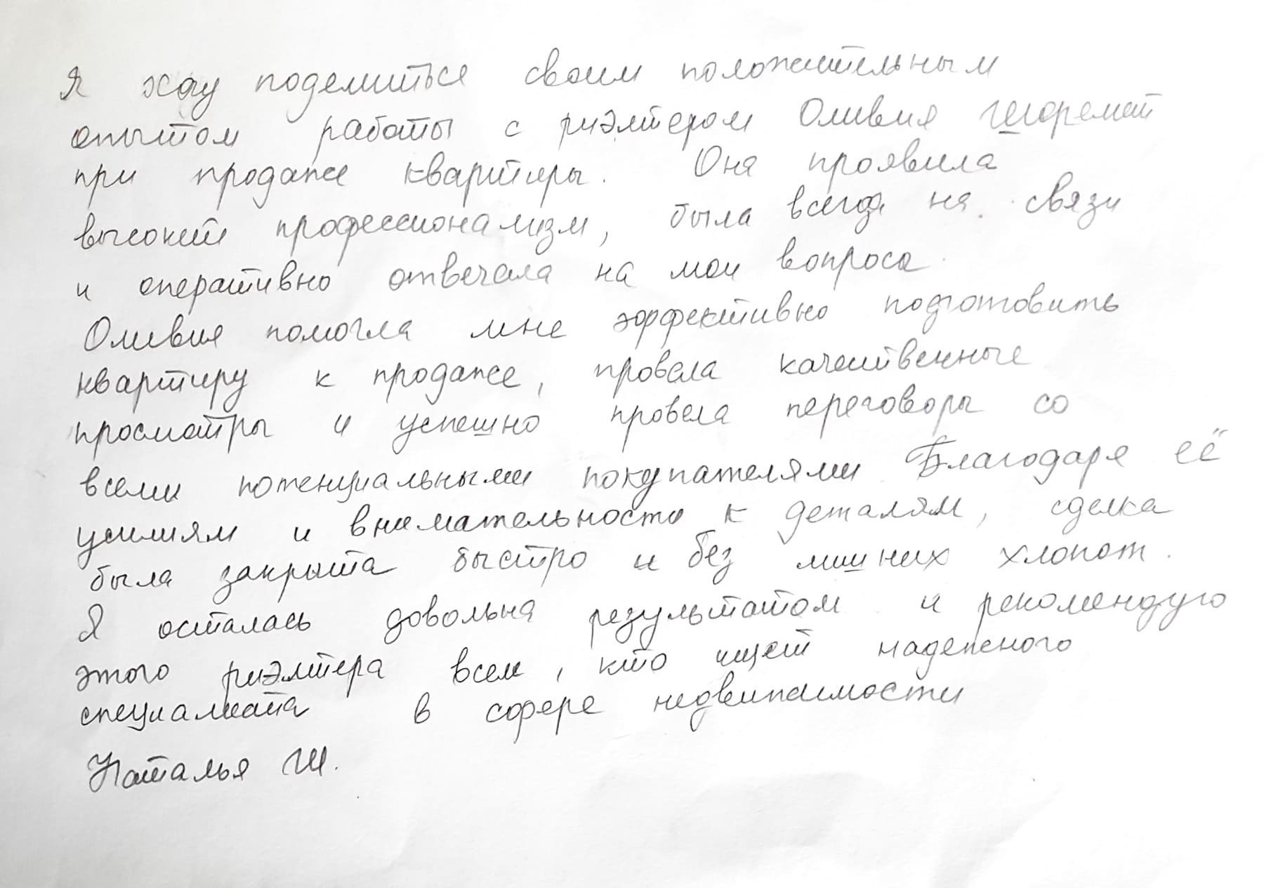 Задоволений ставленням Олени до себе та продавців квартири, до роботи відноситься серйозно, на дати та час приходить завчасно, про зміни попереджає завчасно. Рабчун В.В.