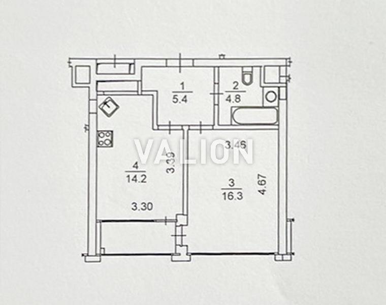 Загальна площа квартири 44,2 кв.м, житлова – 16,3 кв.м, кухня – 14,2 кв.м, поверх 5/25.