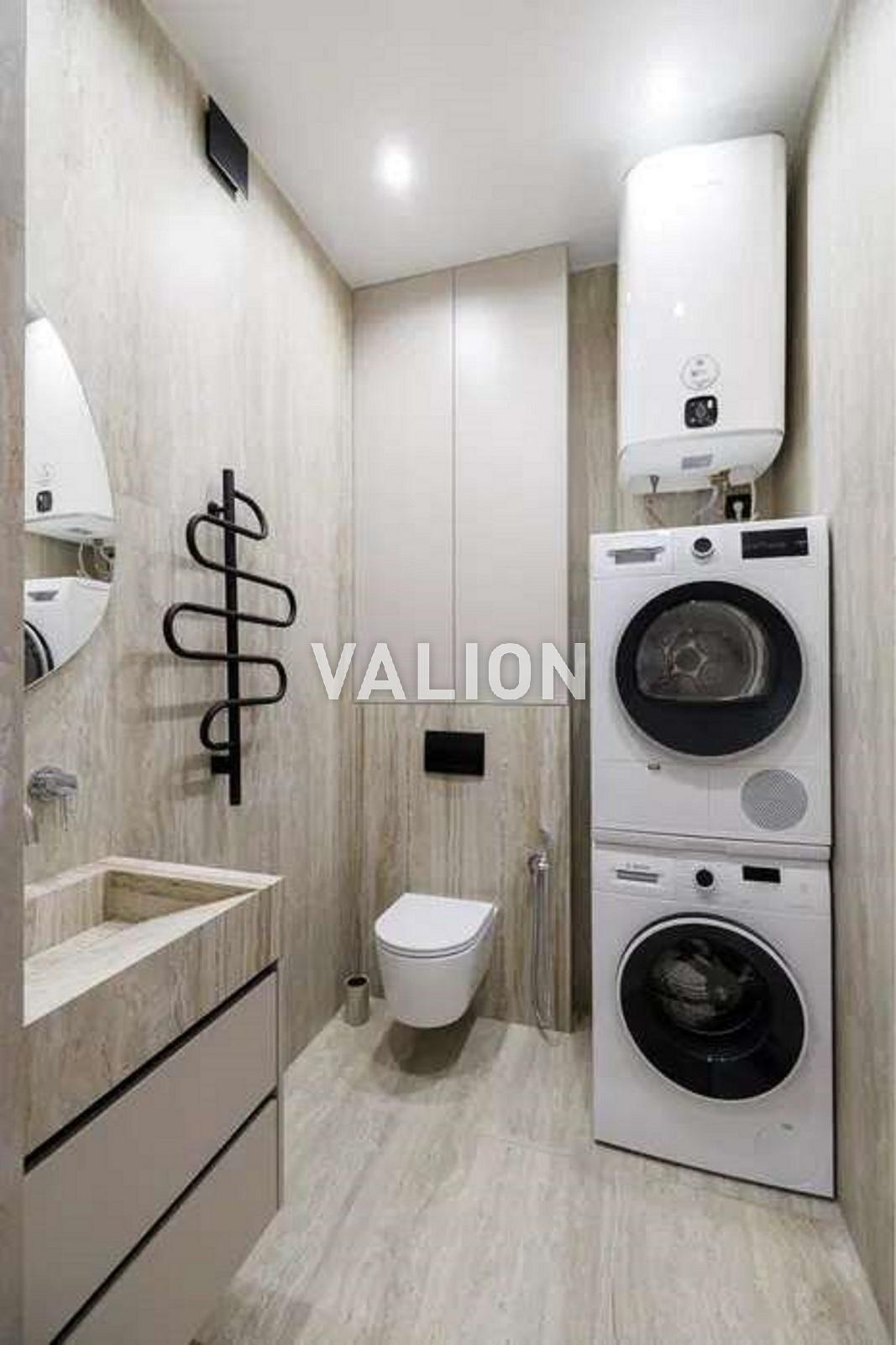При вході — просторий квадратний коридор із кашеміровим ДСП та вбудованою шафою. Два роздільні санвузли з теплими підлогами, італійською сантехнікою, умивальниками з керамограніту. Встановлені пральна і сушильна машини Bosch, бойлер Atlant, кондиціонери в кожній кімнаті. У спальні — дизайнерське ліжко з дорогим ортопедичним кокосовим матрацом.