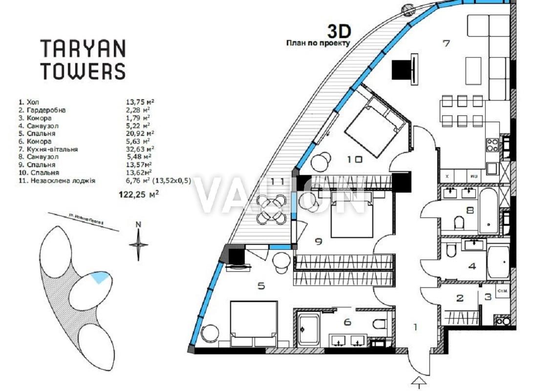3 кімнатна 122/66/34 м2 20/31 эт.
