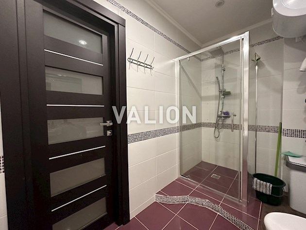 Скляні міжкімнатні матові двері (Німеччина), підлога та стіни керамограніт виробництва (ОАЕ) та дошка (Німеччина) меблі вбудовані (Австрія),